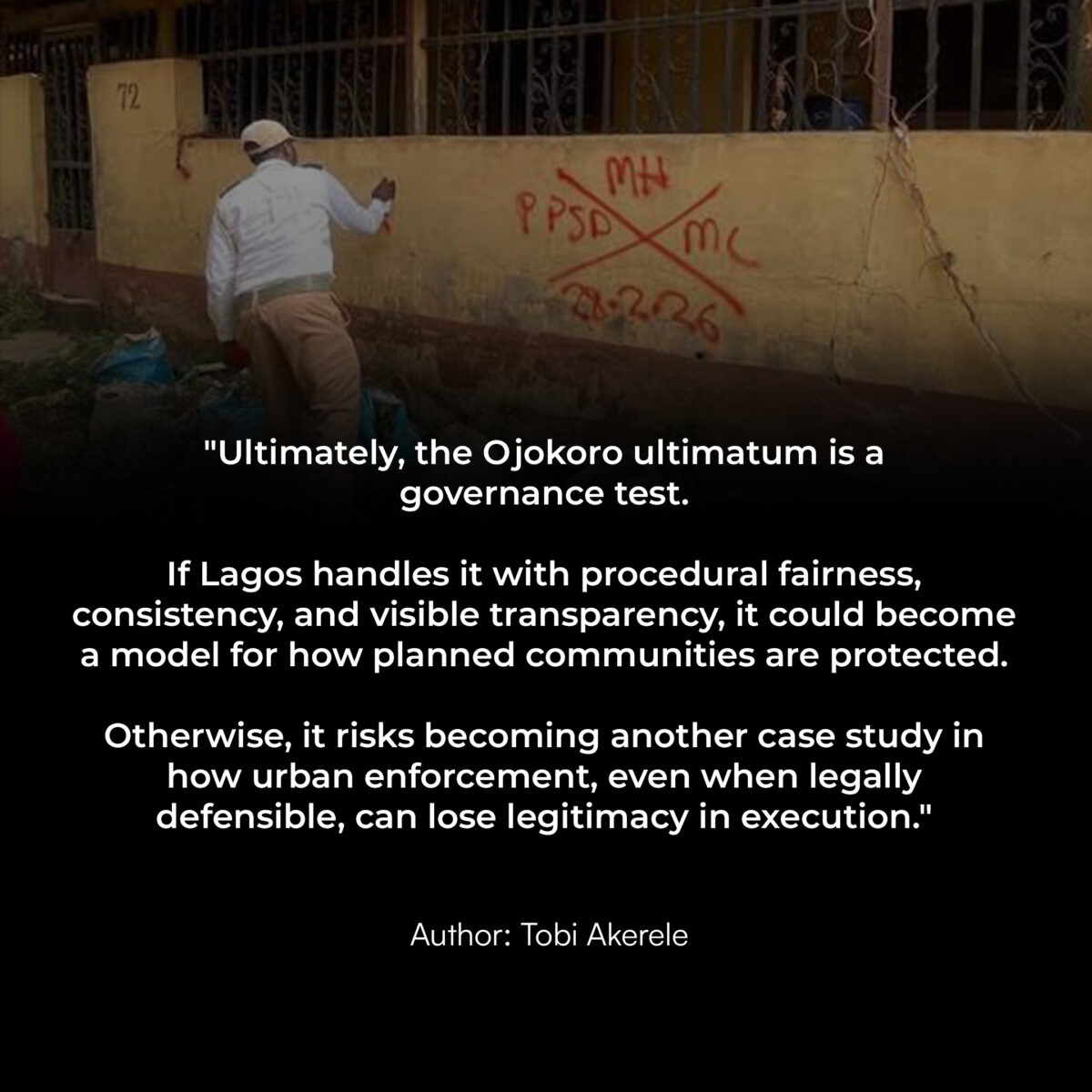 But if enforcement effectively deprives people of substantial property interests or creates severe displacement consequences, the legal and constitutional scrutiny becomes much stronger. That is especially important in Lagos, where housing enforcement has historically been one of the most politically sensitive aspects of urban governance.